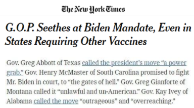 果然,六项措施一经宣布便引来共和党人的激烈抵制,称拜登此举是在“打击私营企业和个人自由”。《纽约时报》用“沸腾”来形容共和党人的反应。