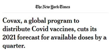 由于富国交付疫苗不足,世卫组织不得不将“新冠肺炎疫苗实施计划”(Covax)今年的疫苗预计供应量削减四分之一以上。