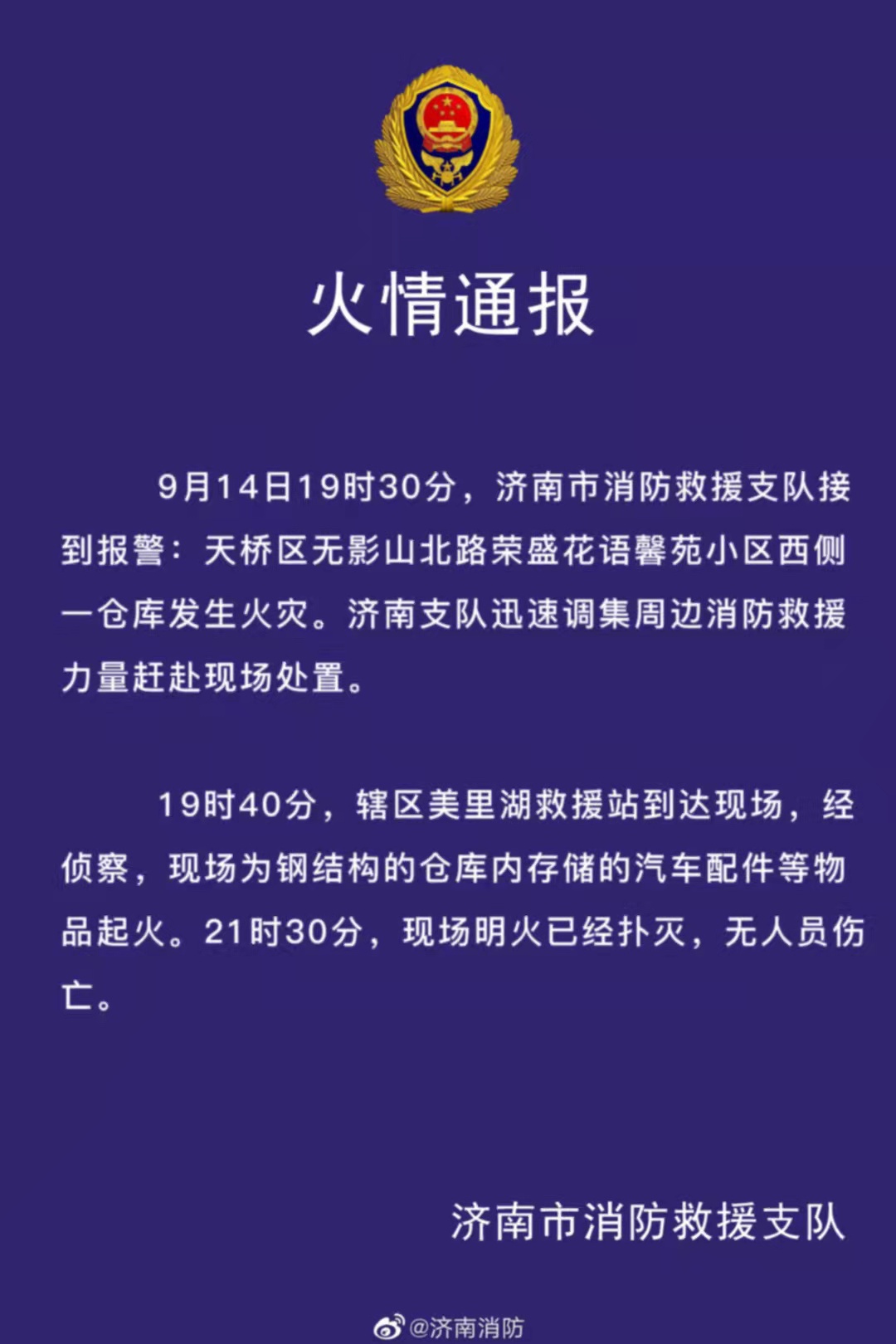 9月14日19时30分,山东省济南市消防救援支队接到报警:天桥区无影山北路荣盛花语馨苑小区西侧一仓库发生火灾。济南支队迅速调集周边消防救援力量赶赴现场处置。19时40分,辖区美里湖救援站到达现场,经侦察,现场为钢结构的仓库内存储的汽车配件等物品起火。21时30分,现场明火已经扑灭,无人员伤亡。(总台记者 张明)