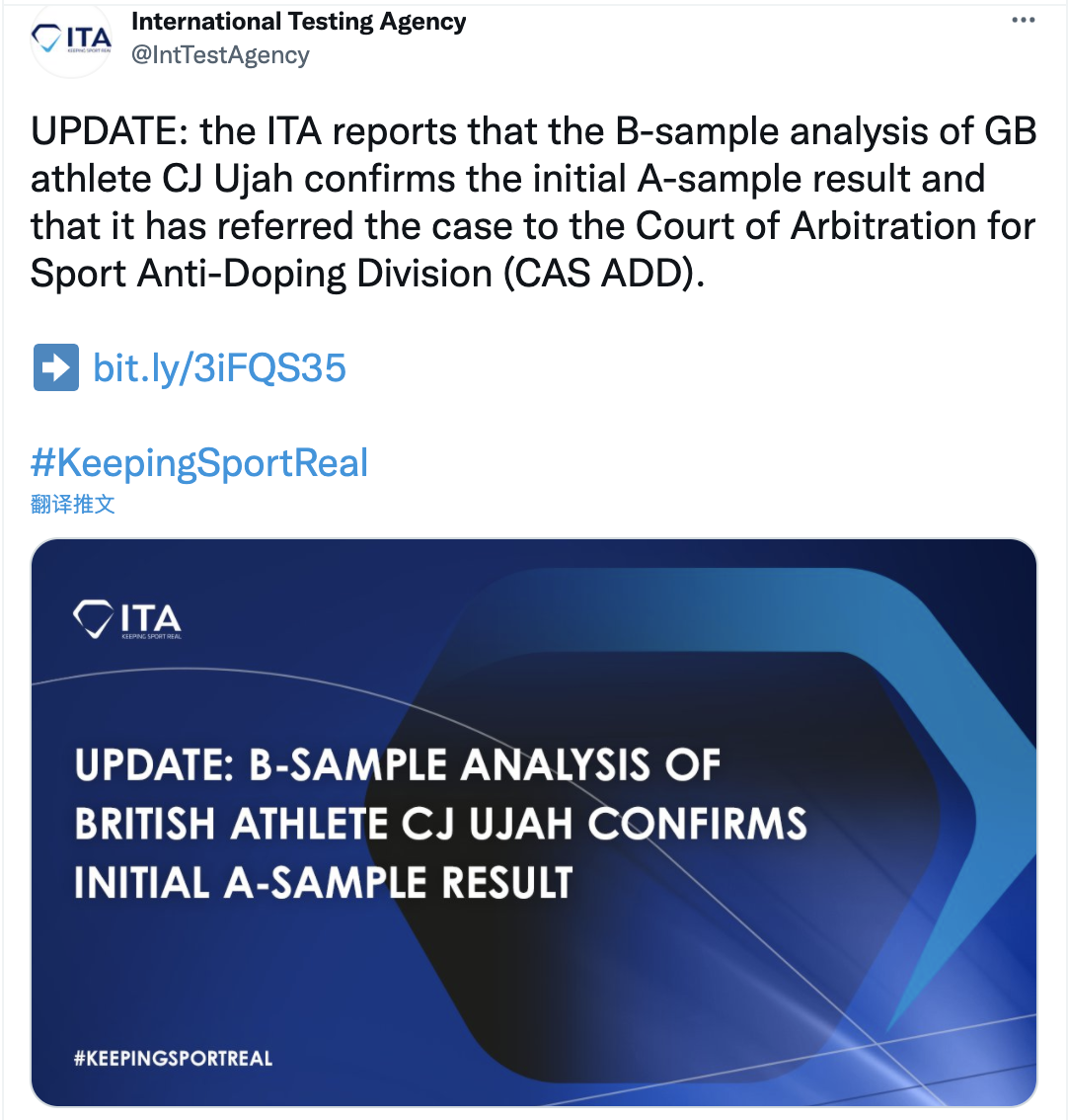 当地时间14日晚,负责东京奥运会兴奋剂检测的国际检测机构(ITA)宣布,英国短跑选手乌贾的B瓶尿样检测结果呈阳性,证实了他在东京奥运会上的初步检测结果。