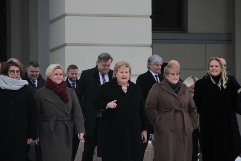 2019年1月22日,在挪威首都奥斯陆,挪威首相、保守党主席埃尔娜·索尔贝格(前排中)和其他内阁成员在王宫前与媒体见面。(新华社记者张淑惠摄)