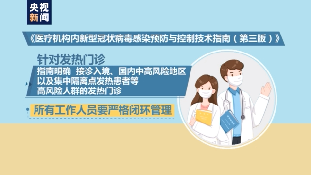 针对发热门诊,指南明确,接诊入境、国内中高风险地区以及集中隔离点发热患者等高风险人群的发热门诊,所有工作人员要严格闭环管理。