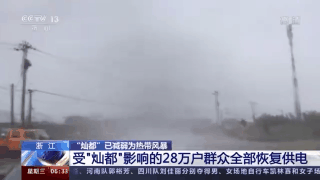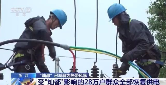 “灿都”带来的风雨,导致浙江部分地区电力设施不同程度受损。国网浙江电力抢修人员第一时间抢修,截至14日18点,浙江受“灿都”影响的28万户群众全部恢复供电。