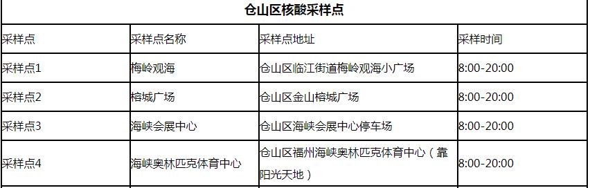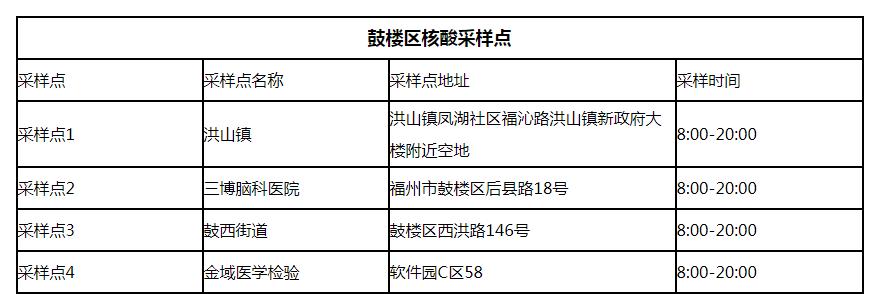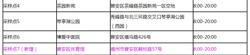 截止到9月15日,福州市鼓楼区、台江区、仓山区、晋安区已累计公布24个核酸检测临时采样点,每天8时至20时开展采样。