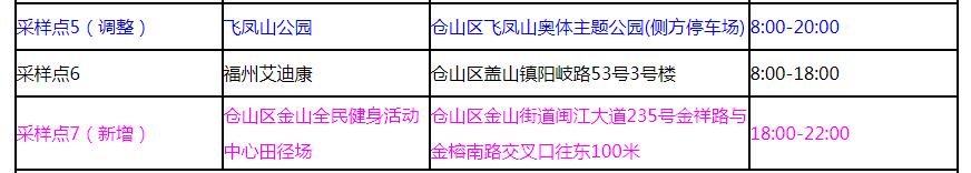 记者从福州市卫健委了解到,按照福州市疫情防控应急指挥部部署,由福州仓山区、晋安区疫情防控应急指挥部负责分别新设置临时大型核酸检测采样点各1个。另外,仓山区原海峡奥林匹克体育中心-4号岗亭采样点调整为飞凤山公园采样点。