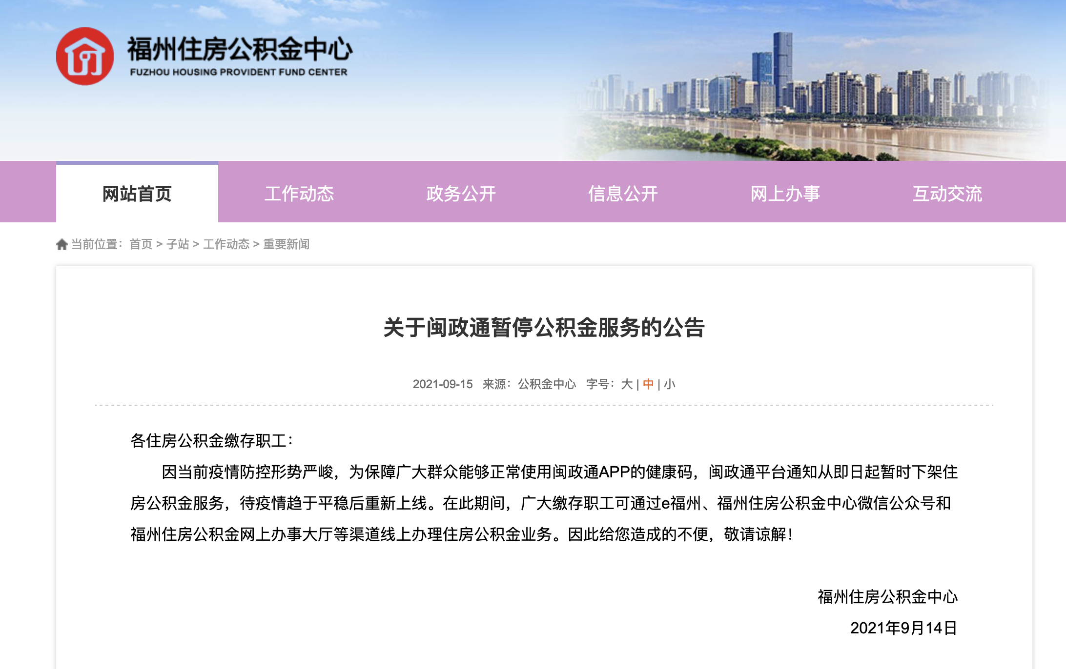 福州住房公积金中心9月14日发布公告,因当前疫情防控形势严峻,为保障广大群众能够正常使用闽政通App的健康码,闽政通平台通知从即日起暂时下架住房公积金服务,待疫情趋于平稳后重新上线。