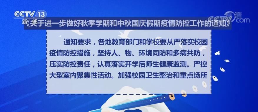 央视网消息:针对即将到来的中秋和国庆假期,教育部通知还要求各地教育部门和学校要从严落实校园疫情防控措施,持续完善应急处置机制,认真做好中秋国庆假期疫情防控和留校师生服务保障工作。