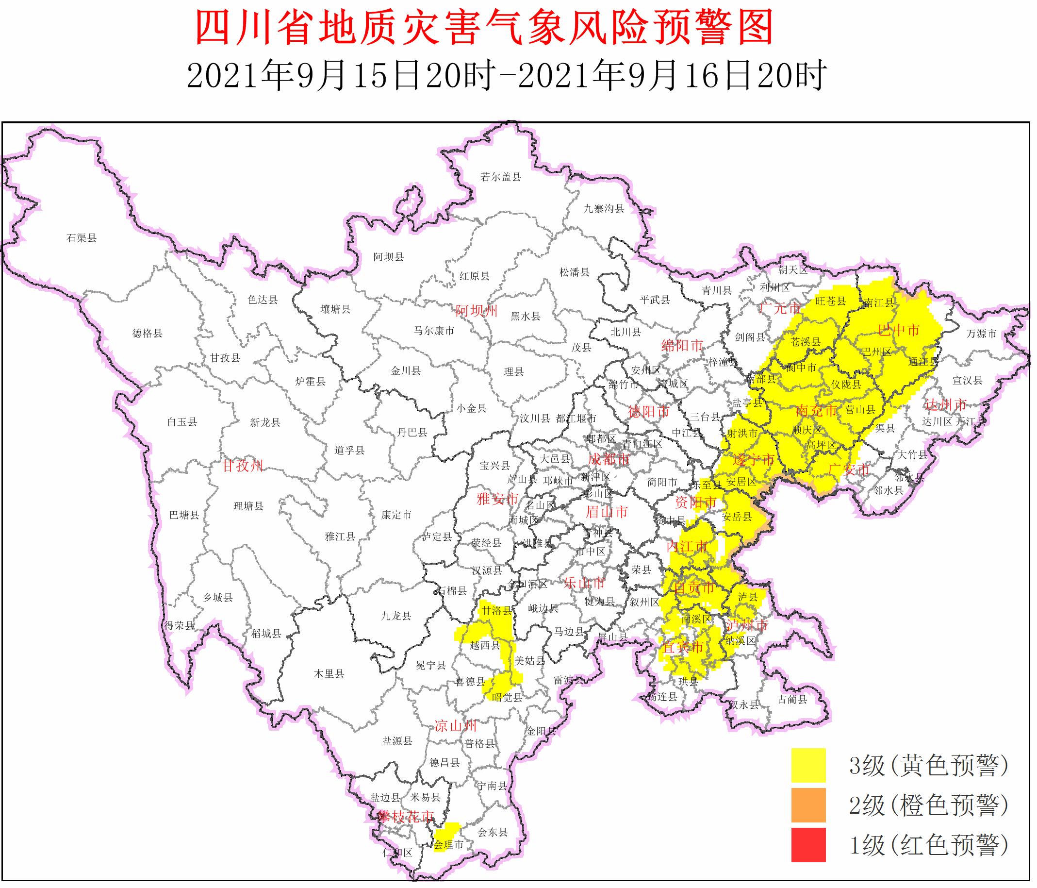 本次3级黄色预警区域为广元利州区、昭化区、旺苍县、剑阁县、苍溪县,绵阳盐亭县、三台县,巴中巴州区、恩阳区、通江县、南江县、平昌县,达州达川区、万源市、宣汉县、渠县,广安市广安区、岳池县、武胜县,南充高坪区、顺庆区、嘉陵区、阆中市、蓬安县、南部县、营山县、仪陇县、西充县,遂宁船山区、安居区、射洪市、蓬溪县、大英县,资阳雁江区、乐至县、安岳县,内江市市中区、东兴区、隆昌市、威远县、资中县,自贡自流井区、贡井区、大安区、沿滩区、荣县、富顺县,宜宾叙州区、南溪区、翠屏区、高县、江安县、长宁县、珙县、兴文县,泸州江阳区、龙马潭区、纳溪区、泸县、叙永县,凉山州会理市、会东县、昭觉县、喜德县、冕宁县、越西县、甘洛县、美姑县等13市(州)68个县(市、区)。