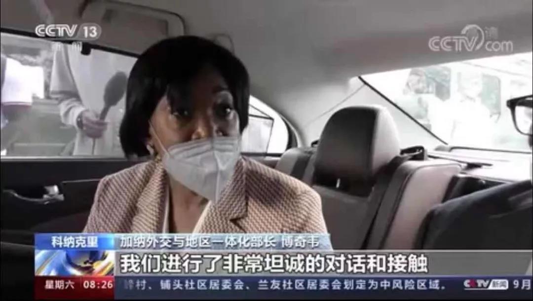 总台记者抢占车窗窗口位置,独家采访到加纳外交与地区一体化部长博奇韦。