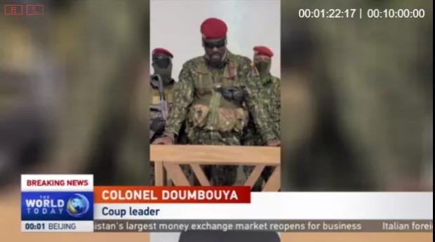 CGTN英语频道播出几内亚武装叛军演讲画面。