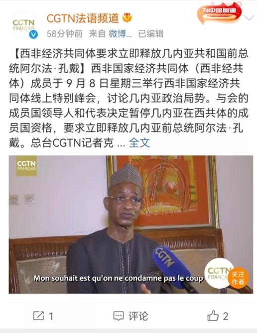 在枪声传出后两小时内,总台CGTN英语新媒体发布消息“几内亚首都传出激烈枪声”,领先路透社、彭博社、BBC等一众西方媒体。