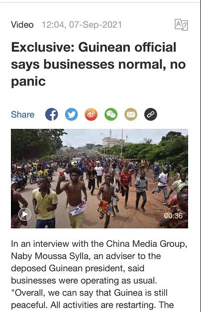 第一天部署神速,总台独家专访逐步展开,权威报道,掷地有声。CGTN英语广播记者苏毅就几内亚国内局势、新政府组建、几中合作等话题,独家专访几内亚总统经济顾问穆萨。