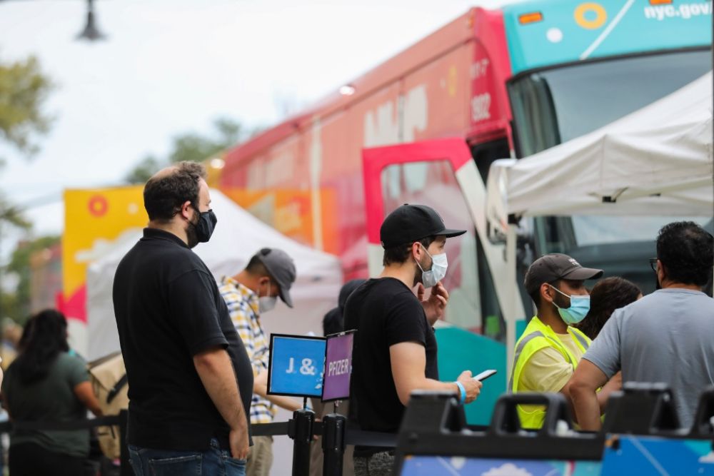 8月31日,人们在美国纽约街头的流动疫苗接种车外排队等候接种新冠疫苗。(新华社记者王迎摄)