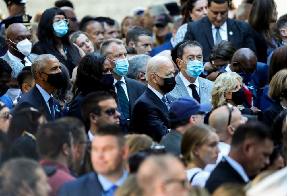9月11日,在美国纽约,美国总统拜登夫妇(中右)、前总统奥巴马夫妇(中左)出席“9·11”恐怖袭击事件二十周年纪念活动。(新华社记者王迎摄)