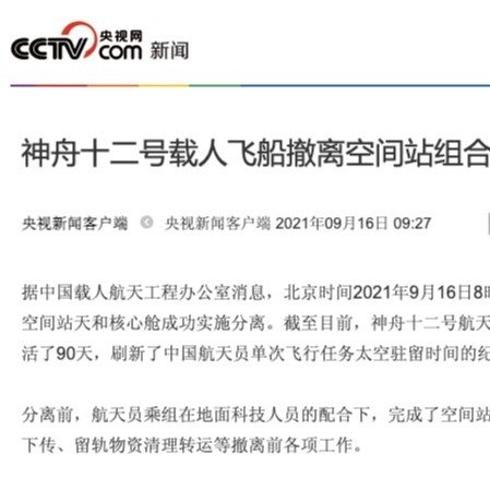 #中国航天员单次飞行任务太空驻留时间纪录被刷新#【#神舟十二号载人飞船撤离空间站组合体#】据中国载人航天工程办公室消息,北京时间2021年9月16日8时56分,神舟十二号载人飞船与空间站天和核心舱成功实施分离。截至目前,神舟十二号航天员乘组已在空间站组合体工作生活了90天,刷新了中国航天员单次飞行任务太空驻留时间的纪录。