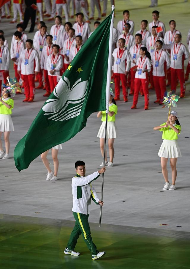 紧随香港特别行政区体育代表团入场的,是澳门特别行政区体育代表团。他们同样博得现场观众的热烈掌声和欢呼。担任旗手的羽毛球运动员裴鹏锋挥舞着澳门特别行政区区旗,运动健儿挥舞国旗和全运会会旗,向观众致意。