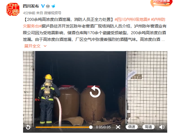 央视网消息:据“四川发布”微博消息,据泸县经济开发区陈年老窖酒厂现场消防人员介绍,泸州陈年窖酒业有限公司因为受地震影响,储酒仓库陶170余个瓷罐受损破裂,200余吨高浓度白酒泄漏。由于高浓度白酒泄漏,厂区空气中弥漫着强烈的酒精气味。高浓度白酒是甲类火灾危险品,遇到火星就会发生爆燃。据悉,该仓库有储酒陶瓷罐1818个、1105吨。四川消防调集9车55名消防指战员在现场处置,对泄漏的白酒进行持续稀释近3个小时,目前酒精浓度仍在危险数值,泸州市消防救援支队纳溪区消防救援大队大队长冯金玉提醒市民请勿在附近使用明火、接打手机,勿靠近附近危险区域。