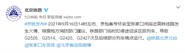 据北京铁路消息,9月16日14时左右,京包客运专线怀安至张家口间临近高铁线路发生火情,根据地方消防部门建议,铁路部门临时扣停途径该区段列车,导致G2526、G2514、G2425、G2427次及后续部分列车晚点运行。