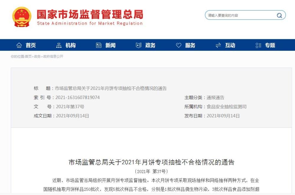 市场监管总局近期组织开展月饼专项监督抽检,采取现场抽样和网络抽样两种方式,在全国随机抽取月饼样品250批次,发现5批次样品不合格,存在食品添加剂超限量使用、防腐剂超标、质量指标不达标、微生物污染问题。