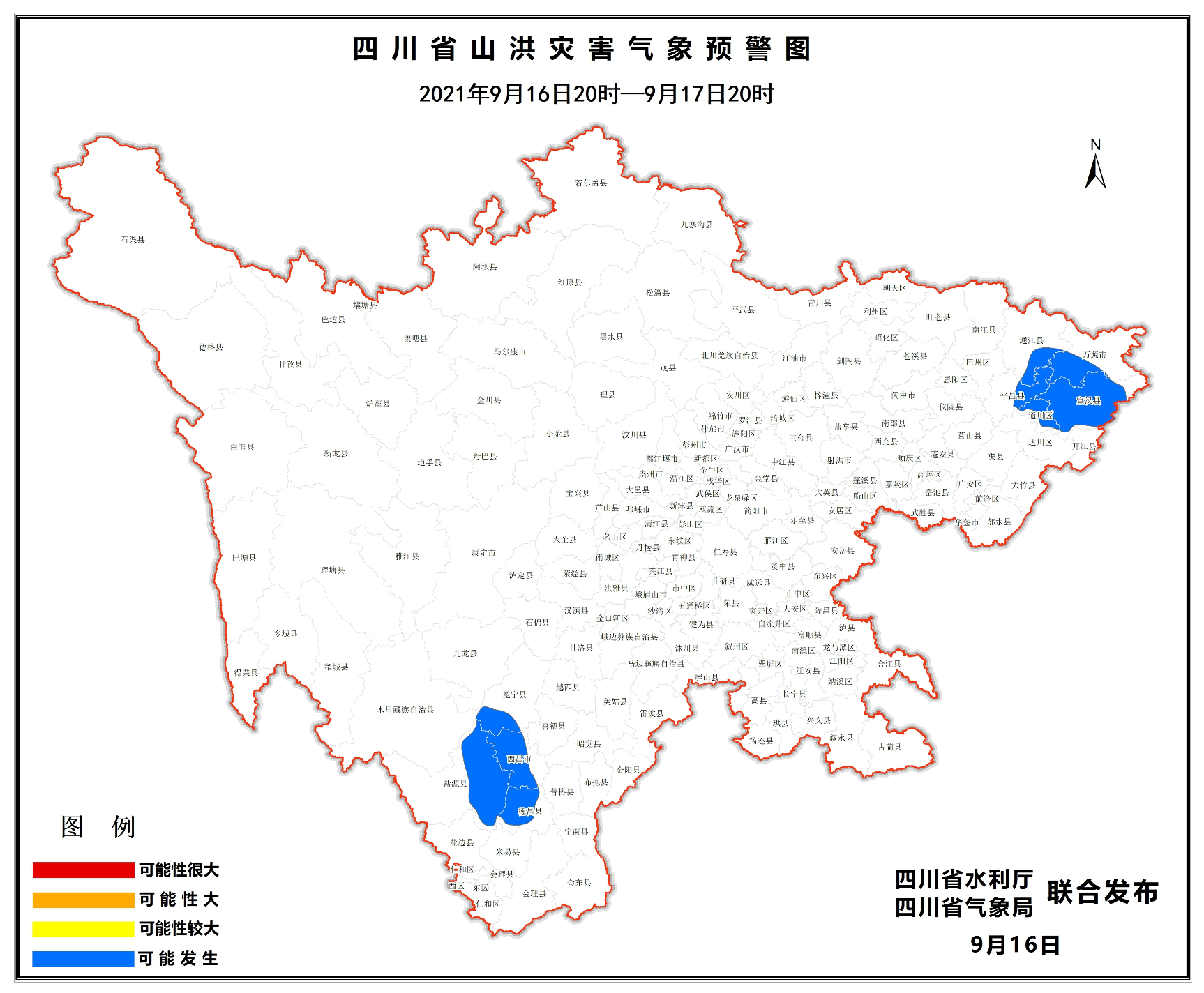 9月16日17时,四川省水利厅联合四川省气象局发布山洪灾害蓝色预警,16日20时至17日20时,四川通川、宣汉、万源、通江、平昌、西昌、德昌、冕宁、盐源等县(市、区)可能发生山洪灾害。