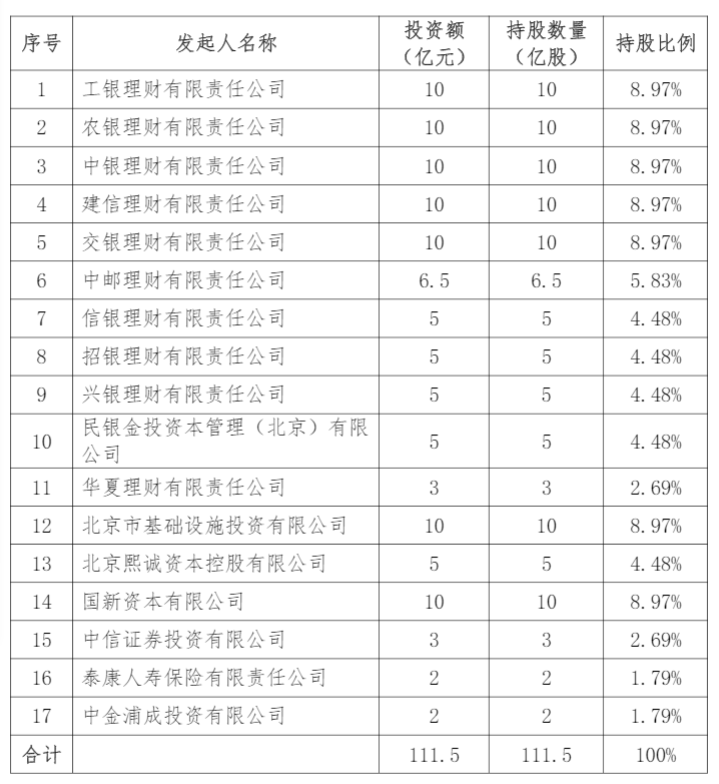 从出资结构看,10家参与筹建的银行理财子公司合计持股比例约七成。其中,工银理财、农银理财、中银理财、建信理财、交银理财各投资10亿元,持股比例均为8.97%;中邮理财投资6.5亿元,持股5.83%;信银理财、招银理财、兴银理财各投资5亿元,持股比例均为4.48%;华夏理财投资3亿元,持股2.69%。