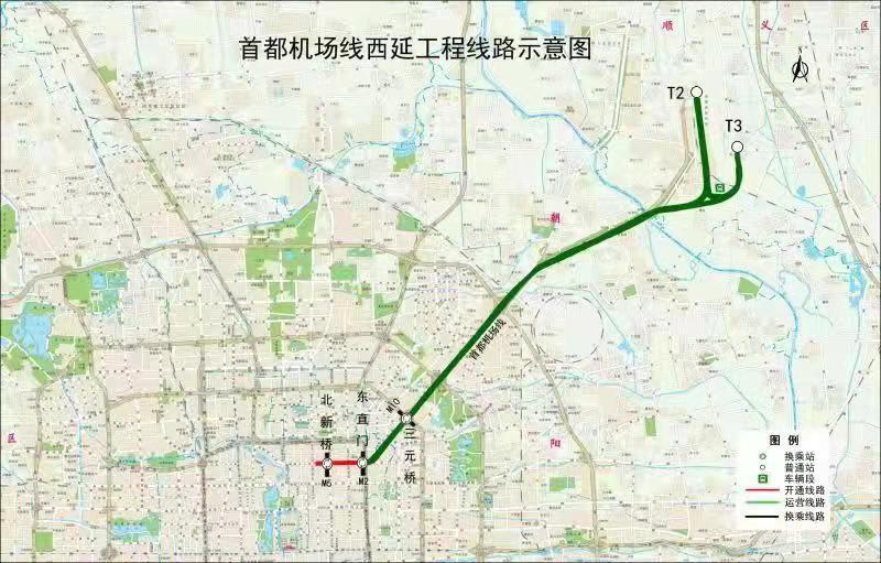 北京地铁首都机场线西延线通车后,将加强首都机场线与北京轨道交通线网联系,缓解既有东直门站客流压力。该线全长约1.8公里,起点为东直门站,终点为北新桥站。在北新桥站设置换乘车站,与5号线换乘。