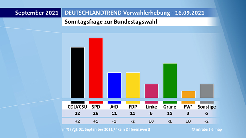 民调显示,社民党的支持率为26%,比上一次调查结果上升了1%;联盟党支持率也小幅增长2%,以22%的支持率排在第二位;绿党的支持率为15%;自民党和右翼政党德国选项党的支持率均为11%;左翼党的支持率为6%。按照目前的民意支持率,德国新一届政府组阁的联合方案依然存在多种可能性。