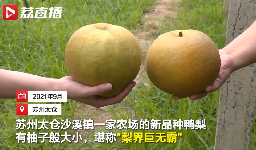 ·真·鸭梨山大!苏州一农场种出4.7斤抗台风鸭梨,有柚子般大小,口感清脆甘甜,堪称“梨界巨无霸”。