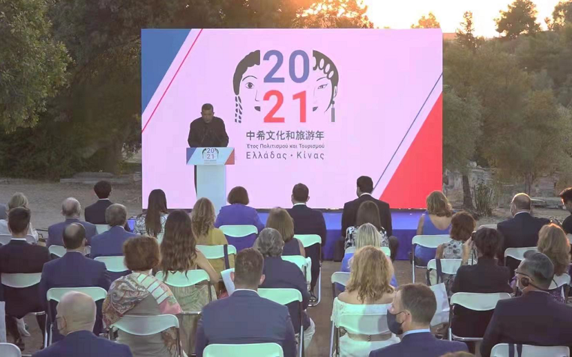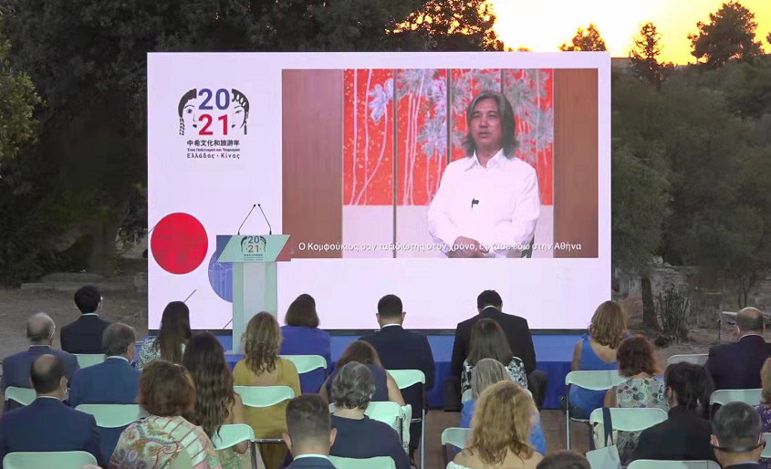 希腊文化和体育部部长门佐尼、希腊旅游部部长基基利亚斯、中国驻希腊使馆临时代办王强为《神遇》组雕揭幕。