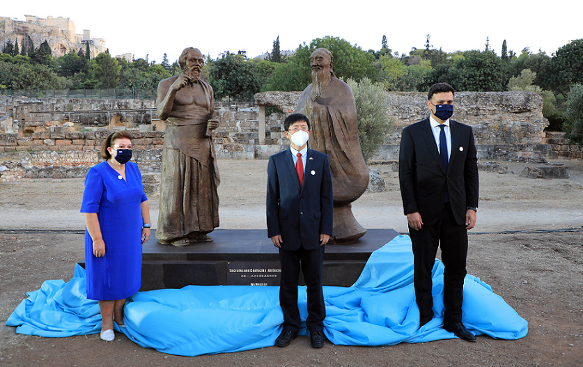 当地时间9月16日,作为2021年“中国——希腊文化和旅游年”开幕式的重要环节之一,国际著名雕塑家、中国美术馆馆长吴为山青铜组雕作品《神遇——孔子与苏格拉底的对话》在希腊雅典揭幕。