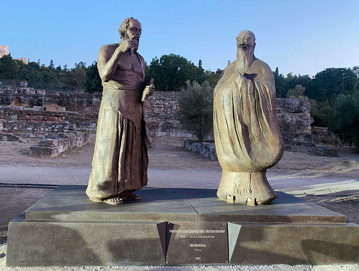 作品以“对话”为主题,以写意雕塑表现孔子和苏格拉底的睿智与风采、精神与哲思。两位分别代表不同文化的圣哲,跨越千年进行着思想的交流、灵魂的对话,不仅表现了中希两国文明互鉴、共同发展的理念,还体现出人类命运的休戚与共。希腊政府选定卫城山脚下的古市集遗址作为该作品落成地。