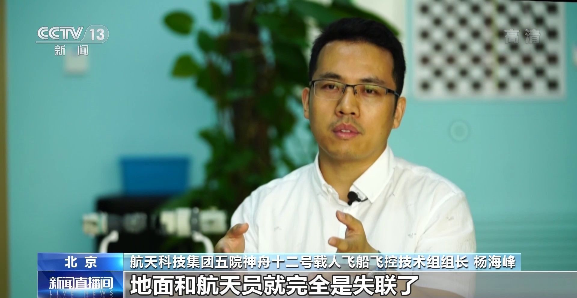 航天科技集团五院神舟十二号载人飞船飞控技术组组长 杨海峰: 因为它是高速摩擦产生气动热,空气周围会形成一个等离子体,我们一般叫通信黑障,这块相当于是地面和航天员完全失联,你即使想发指令想处置也没有办法。