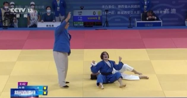 对阵北京队的队友王超,马端斌先发制人,很快就形成了压制局面。本场比赛的常规时间是4分钟,但马端斌只用了25秒,就以一本获胜,拿到了冠军。