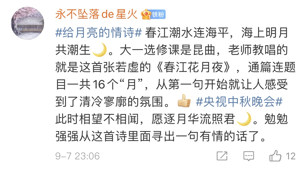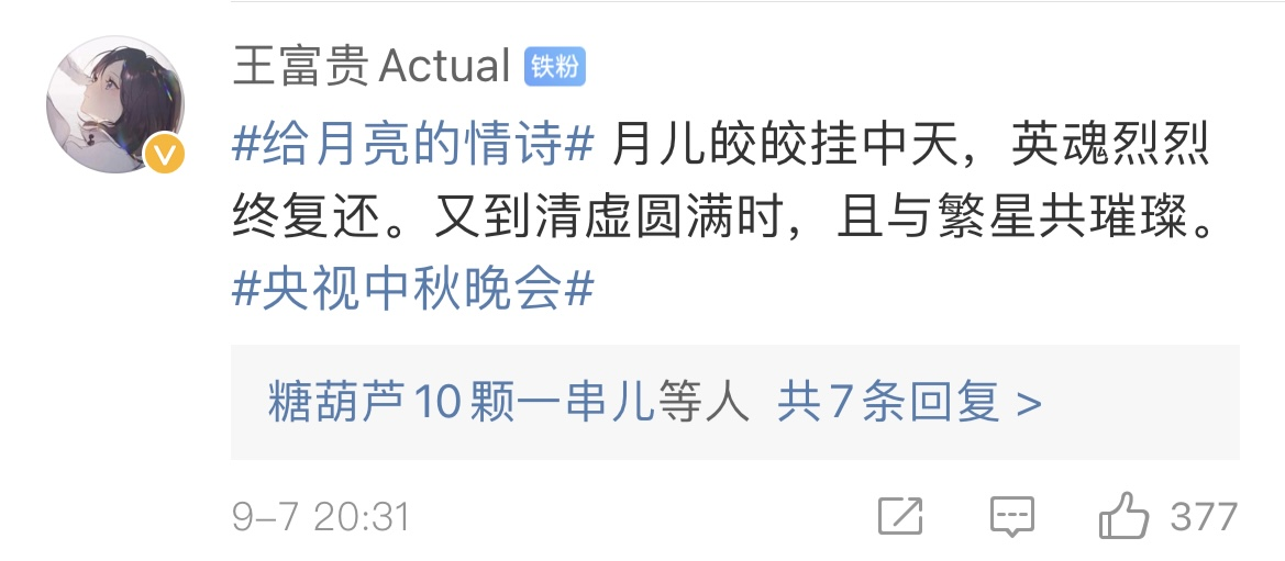 今天,月亮又承载着中国人的航天精神,从把“玉兔号”送上月球,到神舟十二号载人飞船“出差太空”并“顺利归家”。中国人在逐梦太空的道路上,把全部的美好祝愿都讲给了那轮明月。在月亮被寄托了无限情感的背景下,今年秋晚创新性的将月亮作为表白对象,向网友发起#给月亮的情诗#全民共创征集活动,号召大家对月抒怀,一起来为秋晚当气氛组。