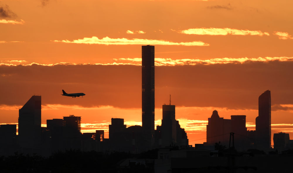 2016年9月7日,在美国纽约,一架飞机在落日余晖中从曼哈顿的高楼上空飞过。(新华社记者殷博古摄)