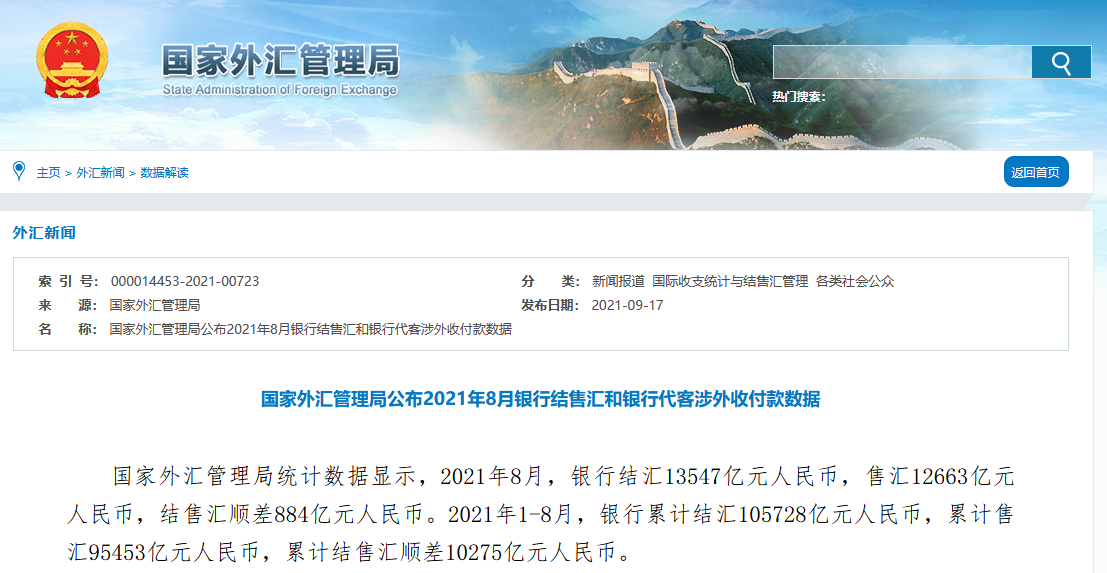 央视网消息:据国家外汇管理局网站消息,国家外汇管理局统计数据显示,2021年8月,银行结汇13547亿元人民币,售汇12663亿元人民币,结售汇顺差884亿元人民币。2021年1-8月,银行累计结汇105728亿元人民币,累计售汇95453亿元人民币,累计结售汇顺差10275亿元人民币。