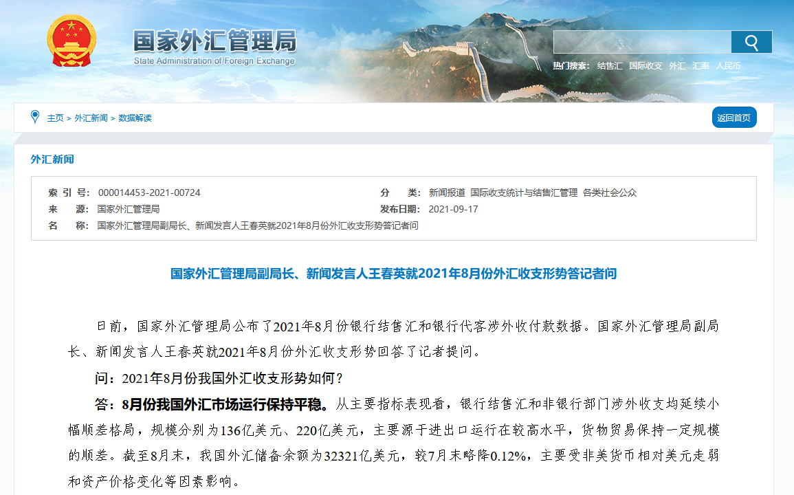 央视网消息:据国家外汇管理局网站消息,日前,国家外汇管理局公布了2021年8月份银行结售汇和银行代客涉外收付款数据。国家外汇管理局副局长、新闻发言人王春英就2021年8月份外汇收支形势回答了记者提问。