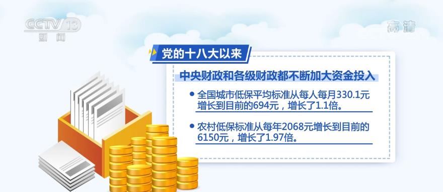 民政部介绍,党的十八大以来,中央财政和各级财政都不断加大资金投入,全国城市低保平均标准从每人每月330.1元,增长到目前的694元,增长了1.1倍。农村低保标准从每年的2068元增长到目前的6150元,增长了1.97倍。