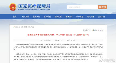 【#多省份新冠病毒核酸检测降价#】近期,国家医保局指导各地医疗保障部门降低公立医院核酸检测价格。截至9月16日,已有广东、湖北、上海、天津、河北等共计30个省份下调公立医院新冠病毒核酸检测价格,绝大多数省份将#核酸检测单人单检价格降至每人份60元#或更低水平,10人混检价格降至每人份15元或更低水平。(记者彭韵佳)