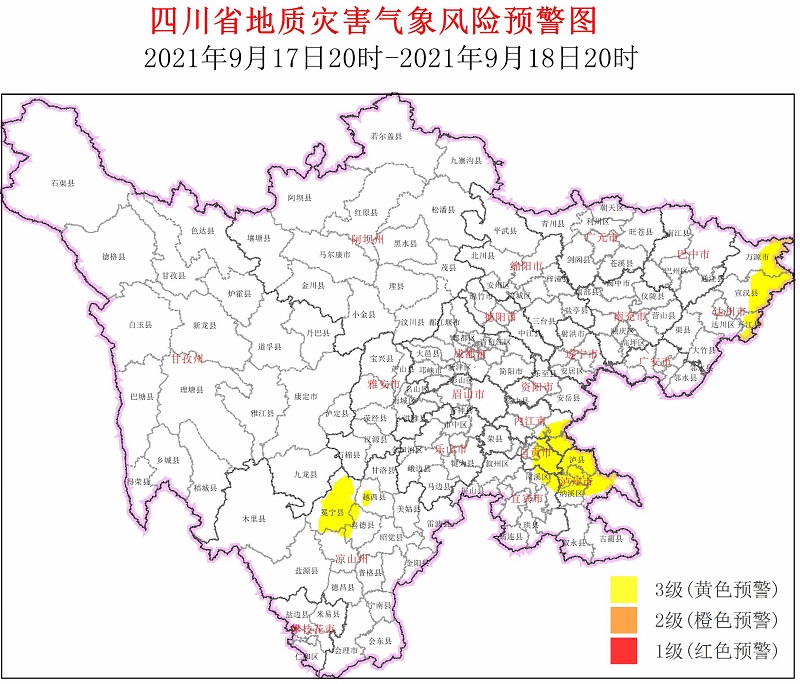 四川省地质灾害指挥部办公室发布消息称,9月17日20时~9月18日20时,地质灾害气象风险3级黄色预警区域为达州万源市、宣汉县、开江县,内江市中区、东兴区、隆昌市,自贡大安区、沿滩区、富顺县,宜宾南溪区、江安县,泸州江阳区、龙马潭区、纳溪区、合江县、泸县,凉山州西昌市、喜德县、冕宁县、越西县等6市(州)20个县(市、区)。