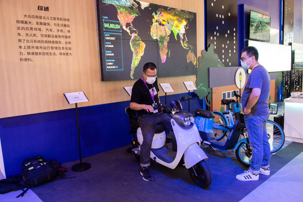 9月16日,在湖南国际会展中心,观众(左)在试驾装有北斗定位装置的电动自行车。新华社记者陈思汗摄