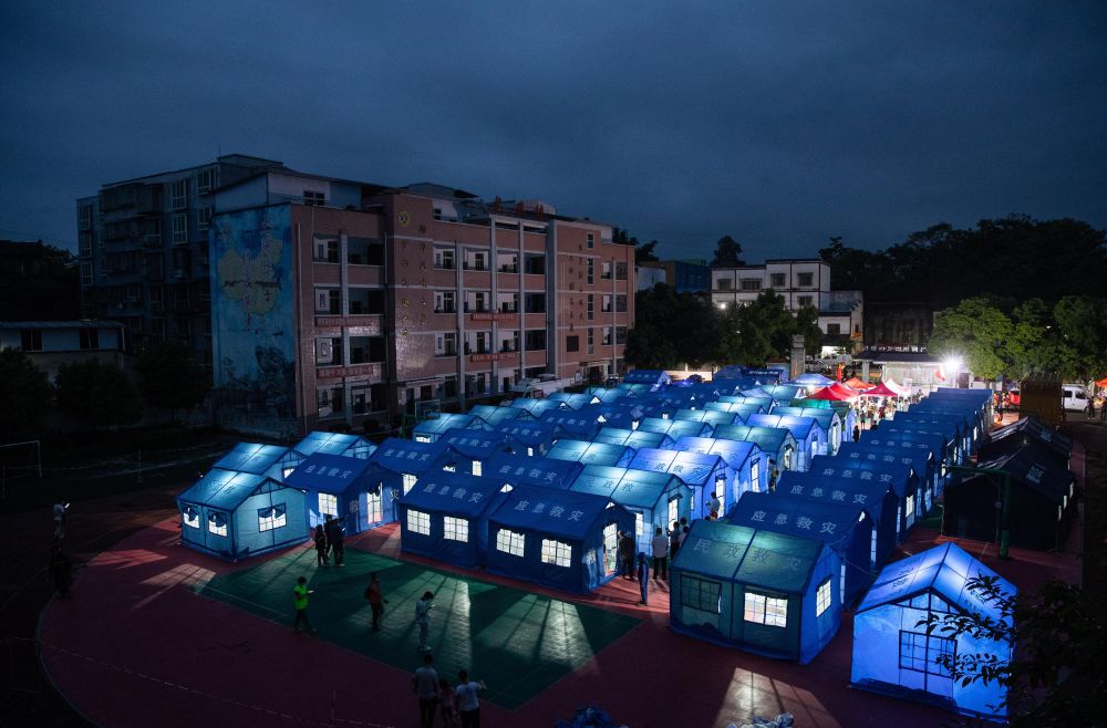 ↑ 9月16日,夜幕中的泸县福集镇龙脑桥中心校安置点。