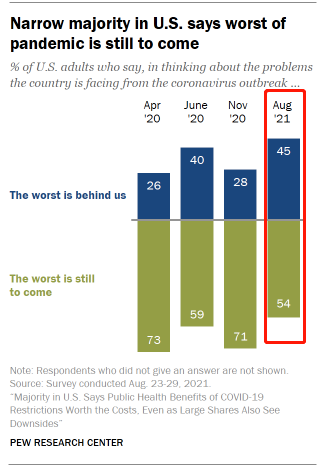 这次民调是在拜登政府宣布对特定人群实施疫苗强制接种令之前进行的。但对于未来,仅仅接种疫苗还无法让人们不再悲观。调查显示,超过一半(54%)的美国人现在担心,“疫情最糟糕的时刻还在后面”。