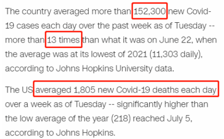 据统计,截至当地时间14日的一周内,美国日均新增病例超过15万,是今年日均水平最低的6月22日的13倍以上;日均病亡1800人,远远高于7月5日病亡218人的今年最低日均水平。