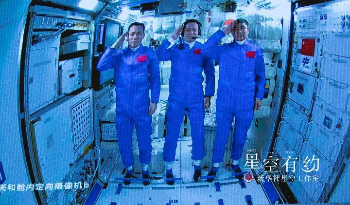 6月17日在北京航天飞行控制中心拍摄的进驻天和核心舱的航天员向全国人民敬礼致意的画面。(新华社记者 金立旺 摄)
