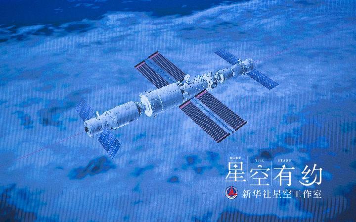这是6月17日在北京航天飞行控制中心拍摄的神舟十二号载人飞船与天和核心舱自主快速交会对接成功的画面,与此前已对接的天舟二号货运飞船一起构成三舱(船)组合体。(新华社记者 金立旺 摄)