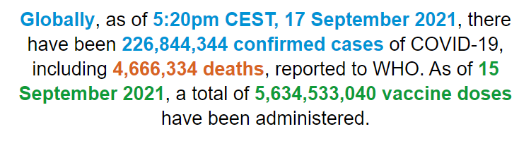根据世卫组织最新实时统计数据,截至欧洲中部夏令时间9月17日17时20分(北京时间9月17日23时20分),全球累计新冠肺炎确诊病例226844344例,累计死亡病例4666334例。17日全球新冠肺炎确诊病例新增571075例,死亡病例新增9400例。(总台记者 朱赫)