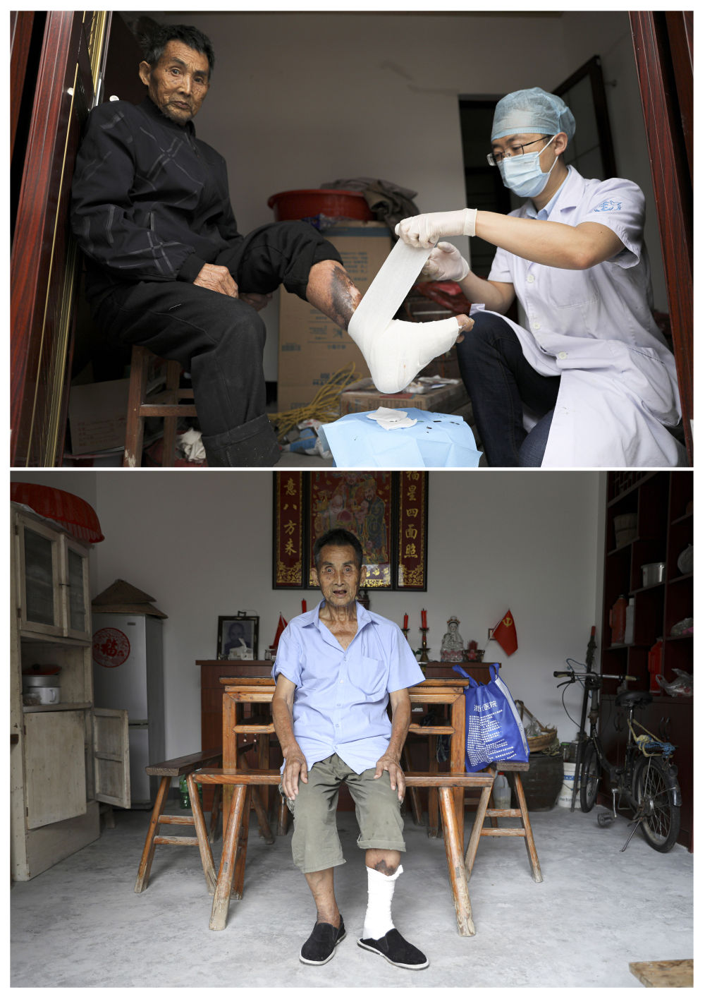 ↑拼版照片:上图为2020年10月15日,医务人员上门为杜世玉换药;下图为2021年9月3日,杜世玉在衢州市衢江区杜泽村家中。