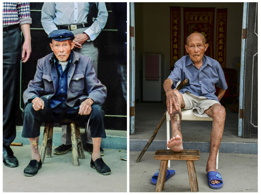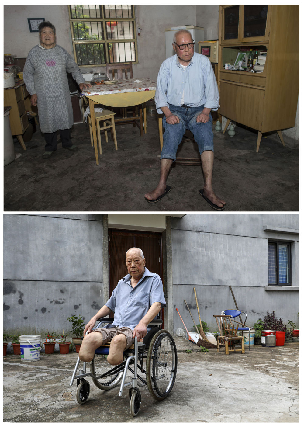 ↑拼版照片:上图为2015年4月29日,张宝善在衢州市柯城区花园街道东周村家中(新华社记者韩传号摄);下图为2021年9月3日,截肢后的张宝善在家中留影(韩强 摄)。