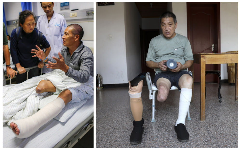 ↑拼版照片:左图为2016年10月24日,姜水根在医院接受截肢手术后与探望人员交谈;右图为2021年9月3日,姜水根在衢州江山市大陈乡大陈村家中脱下假肢。新华社发(韩强 摄)